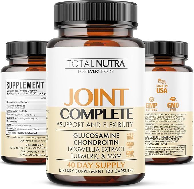 - EIGHT-IN-ONE JOINT SUPPLEMENTS: Total Nutra’s Chondroitin & Glucosamine Nutritional Supplements combine 8 powerful Cartilage, Ligament, Tendon & Joint Care Ingredients into one mighty Glucosamine Complex to support joint mobility, flexibility & overall comfort. We’re sure you’ll love these joint relief supplements