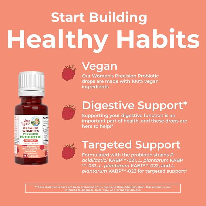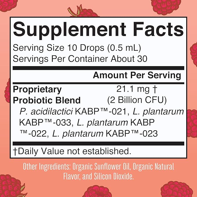- Mary Ruth Probiotic Liquid Drops: Formulated with the probiotic strains P. acidilactici KABP-021, L. plantarum KABP-033, L. plantarum KABP-022, and L. plantarum KABP-023 for targeted support. These easy-to-take & delicious raspberry-flavored drops are a great incorporation into your daily routine!
