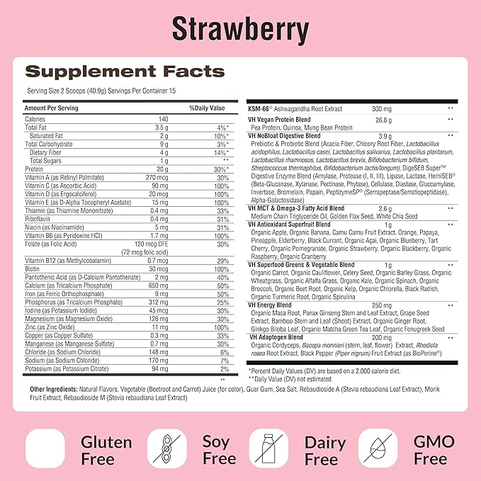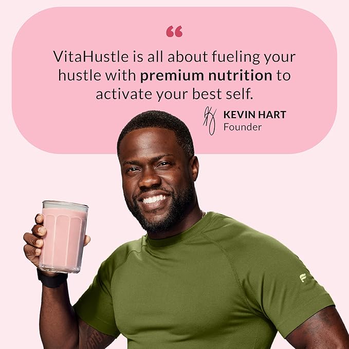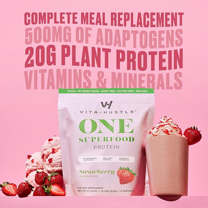 VitaHustle ONE - Superfood Meal Replacement Shake, Plant Based Protein Powder, Vegan. 86 Superfoods, Vitamins, & Minerals, Ashwagandha, Adaptogens. Founded by Kevin Hart. (Strawberry) 15 Servings