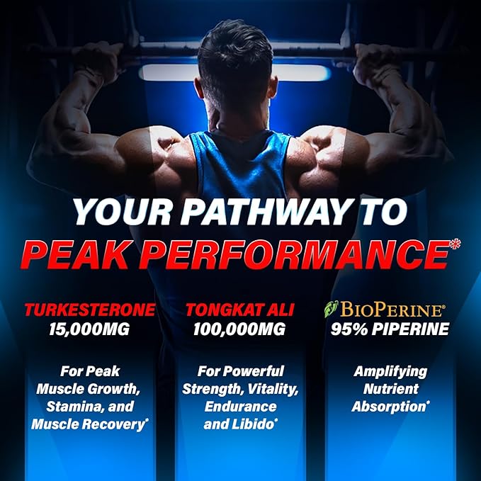 - Maximize Your Potential - Whether you're a seasoned athlete or embarking on your fitness journey, our Turkesterone formula is designed to push you to your goals! Combining Turkesterone, Tongkat Ali, and BioPerine, it aims to enhance endurance, alleviate fatigue, and shorten recovery times between workouts. With increased stamina and decreased muscle soreness, you'll push your limits further and achieve the lean, defined physique you desire.