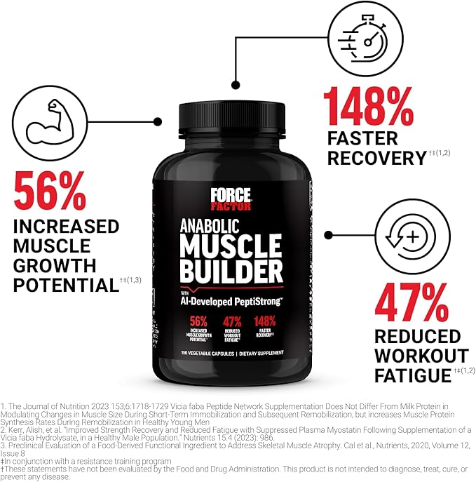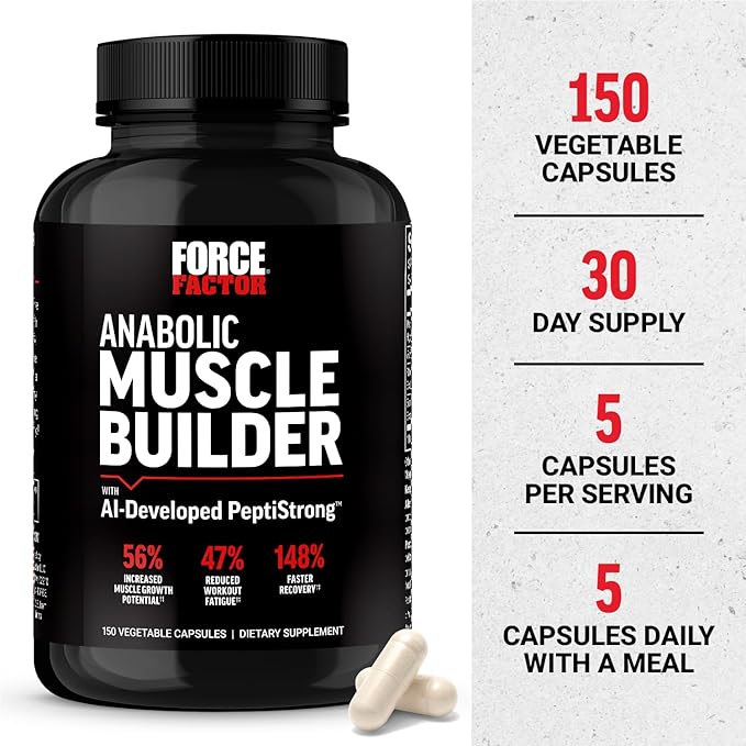 FORCE FACTOR Anabolic Muscle Builder, Muscle Building Support Supplements for Men, Supports Muscle, Strength, and Recovery, Reduces Fatigue, with AI-Developed PeptiStrong, 150 Capsules