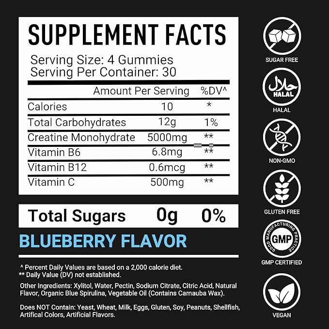 - Tasty & Sugar-Free - Enjoy the benefits of our creatine gummies for men and women. Each serving contains 5000mg of sugar-free creatine gummies, enhanced with Vitamin B12 and Vitamin C for maximum muscle strength and energy. These vegan creatine gummies are meticulously crafted to support your muscle-building goals and ensure you achieve peak performance in your workouts.