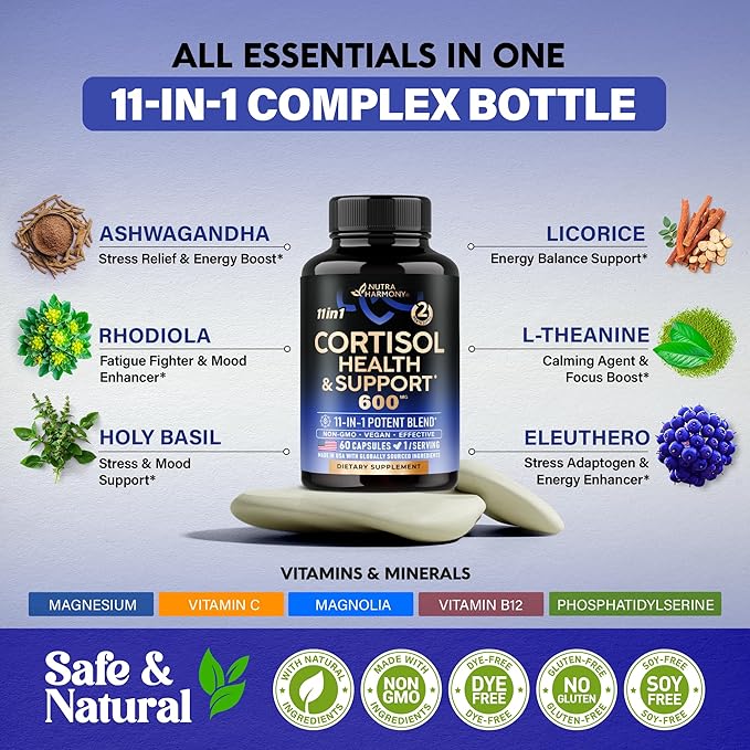 - 11 in 1 Herbal Blend – Experience the power of 11 handpicked herbs working together seamlessly — Ashwagandha, Rhodiola Rosea, Holy Basil, Licorice, Magnolia. Elevate your cortisol wellness with our expertly formulated herbal complex.