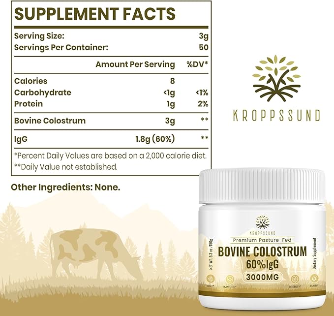 Kroppssund Bovine Colostrum Powder Supplement 3000 mg - Extra High 60% IgG Bovine Colostrum - Gut, Bone, Exercise, Immune - 50 Servings (1 Bottle)