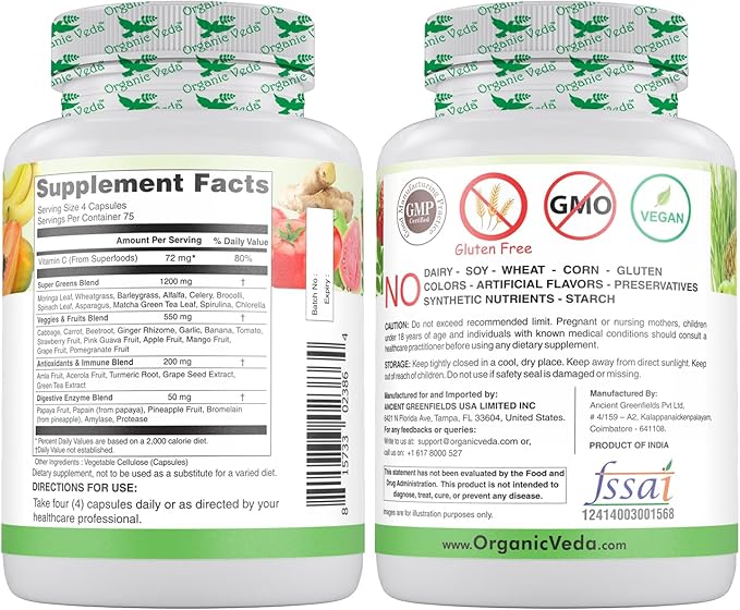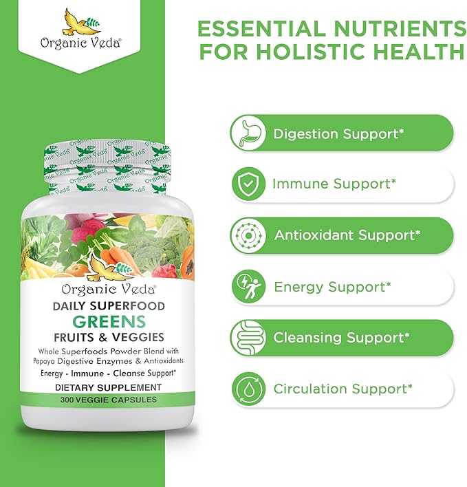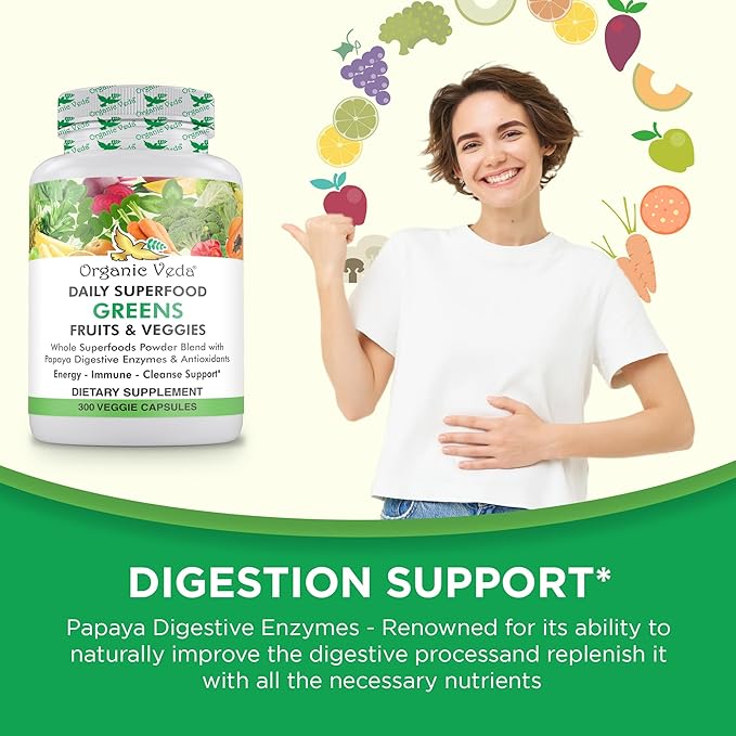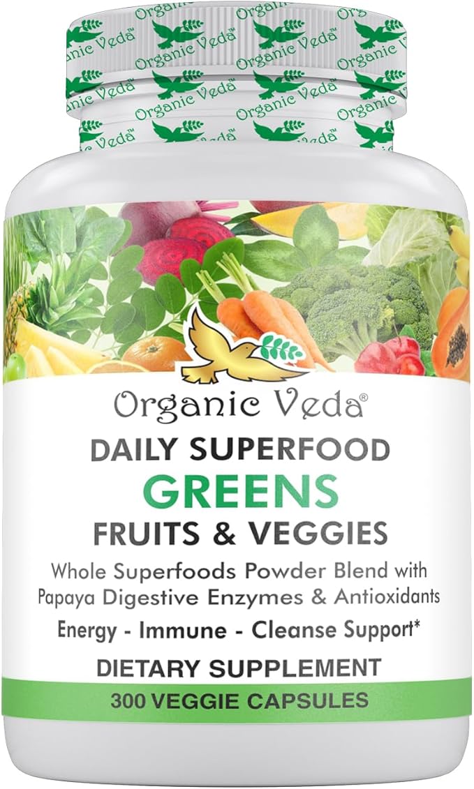 Organic Veda Superfood Greens Fruits & Vegetables 300 Capsules | 30 Daily Organic Fruits & Veggies with Chlorophyll, Papaya Enzymes, Acerola Vitamin C, Turmeric, Beet, Moringa, Green Tea Extract