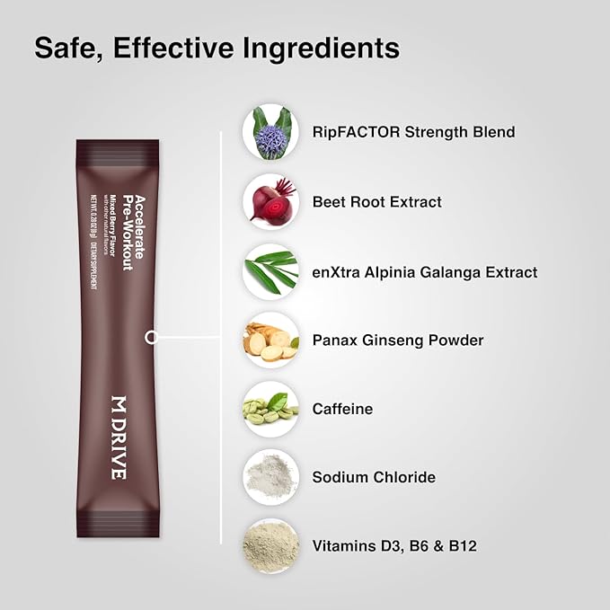 - Mdrive Accelerate Pre-Workout helps improve strength gains in as fast as 2 weeks; Our pre workout powder in a single serving satchel boosts pump with increased Nitric Oxide production