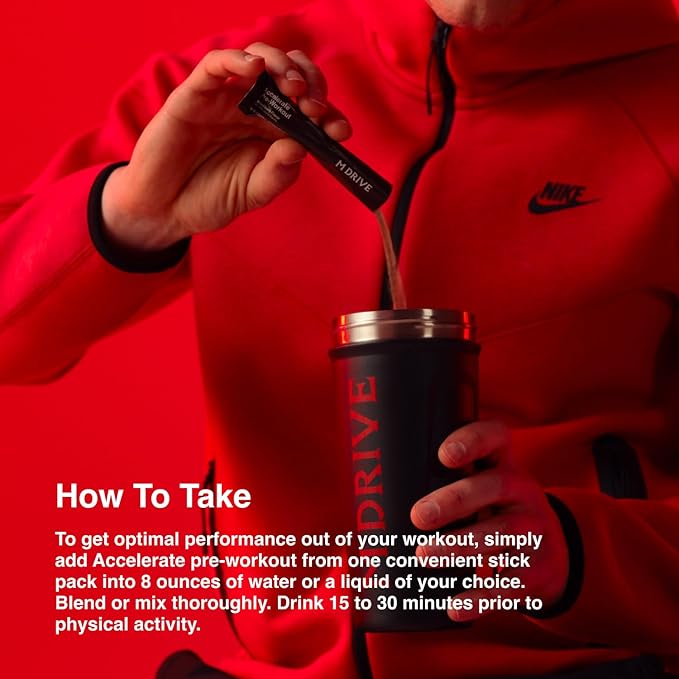 - To get optimal performance out of your workout, simply add Accelerate pre-workout from one convenient stick pack into 8 ounces of water or a liquid of your choice; blend or mix thoroughly and drink 15 to 30 minutes prior to physical activity
