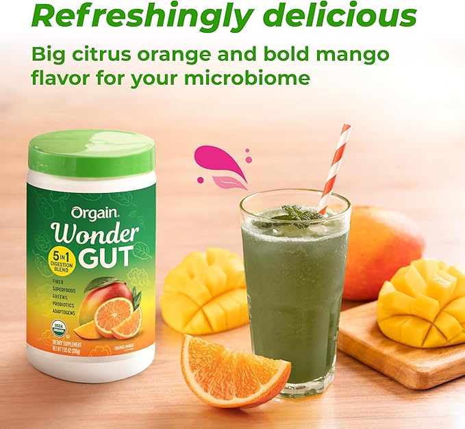 Orgain Organic Wonder Gut Fiber Supplement Powder, 5 in 1 Blend with 1 Billion Probiotics, Greens, Vitamin C, Adaptogens for Gut Health and Immune Support, Non-GMO, Orange Mango, 7.05 oz