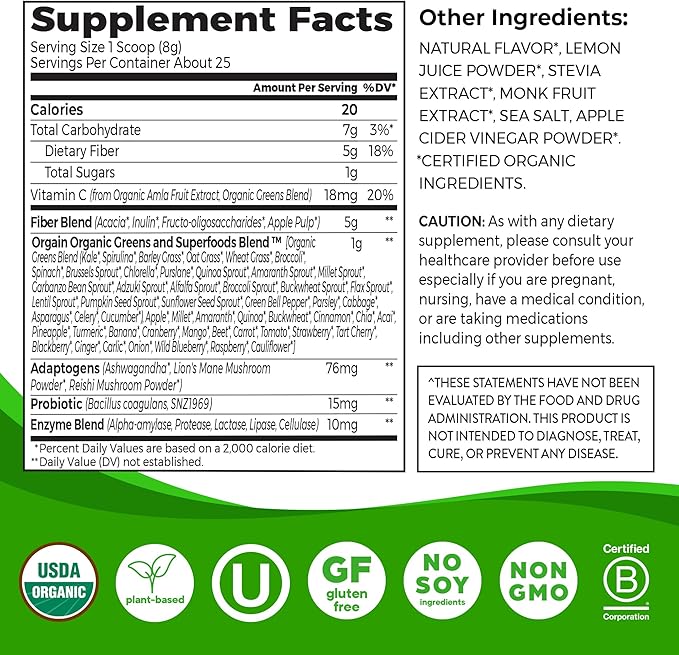 - 5-IN-1 PLANT BASED DIGESTION BLEND: Packed with nutrients from 5g of Fiber*and crafted with 50 Superfoods Blend, 25 Organic Greens, 1 Billion CFU* Probiotics and Adaptogens, 1g of sugar. This also includes Vitamin C for immune support.