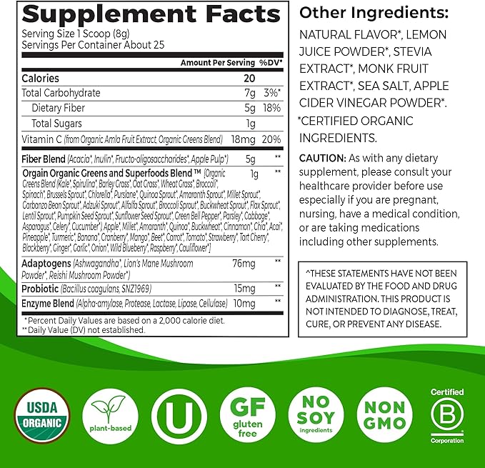 - CLEANER INGREDIENTS: Superfoods from ingredients such as organic ancient grains, berries, fruits, greens, grasses, veggies, herbs and sprouts. It also features probiotics to support gut health** and adaptogens from ashwagandha, reishi, and lion’s mane.