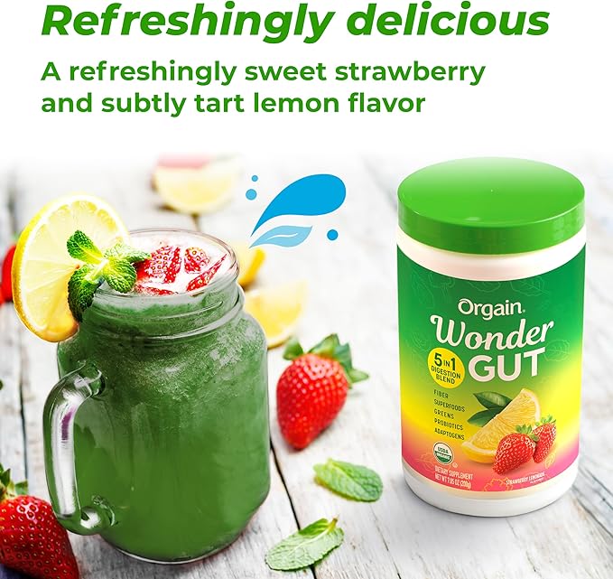 Orgain Organic Wonder Gut Fiber Supplement Powder, 5 in 1 Blend with 1 Billion Probiotics, Greens, Vitamin C, Adaptogens for Gut Health and Immune Support, Non-GMO, Strawberry Lemonade, 7.05 oz