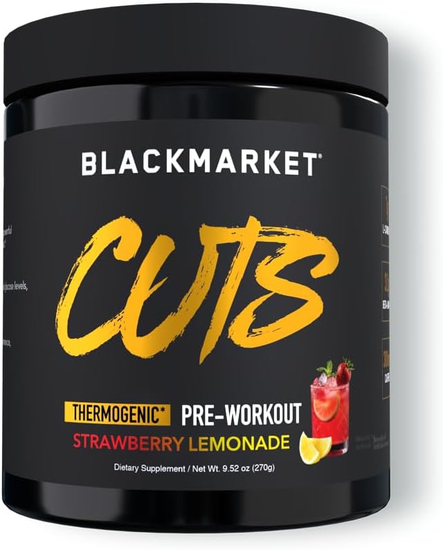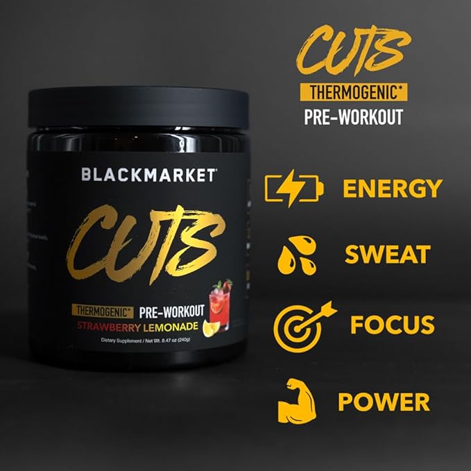BLACKMARKET CUTS Pre Workout - Flavored Energy Powdered Drink Mix for Men & Women, Great for Muscle Definition, Thermogenic, Creatine Free, (Strawberry Lemonade, 30 Servings)
