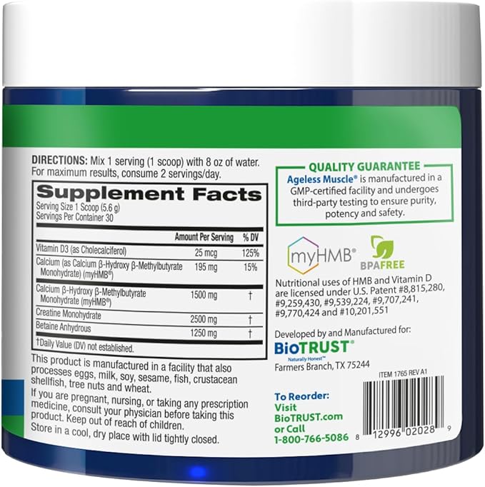 - MADE IN THE USA, GMP QUALITY. BioTRUST Ageless Muscle is manufactured in the USA in a GMP-certified facility using domestic and imported materials and undergoes third-party lab testing to ensure purity, potency and safety.
