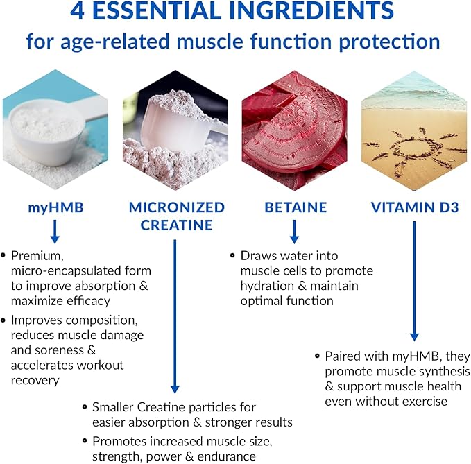 - CREATINE HMB + VITAMIN D3, & BETAINE. So much more than your average creatine powder. Ageless Muscle is expertly formulated with Micronized Creatine, HMB, Vitamin D3 & Betaine to support muscle recovery and preservation.