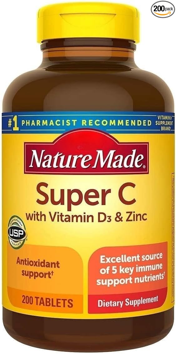 Nature Made Super C with Vitamin D3 and Zinc, 200 Tablets Bundle | Vitamin C (900 mg), Vitamin A (450 mcg), Vitamin D3 (25 mcg/1000 IU), Vitamin E (15 mg) and Zinc (11 mg) | 100 Day Supply