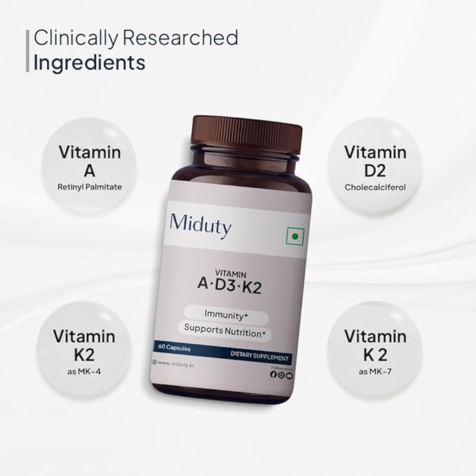 - Unique Formulation Miduty'S Vitamin Adk Has A Unique Formula Which Includes Vitamin A And Vitamin K2 With Vitamin D3 Supplement.