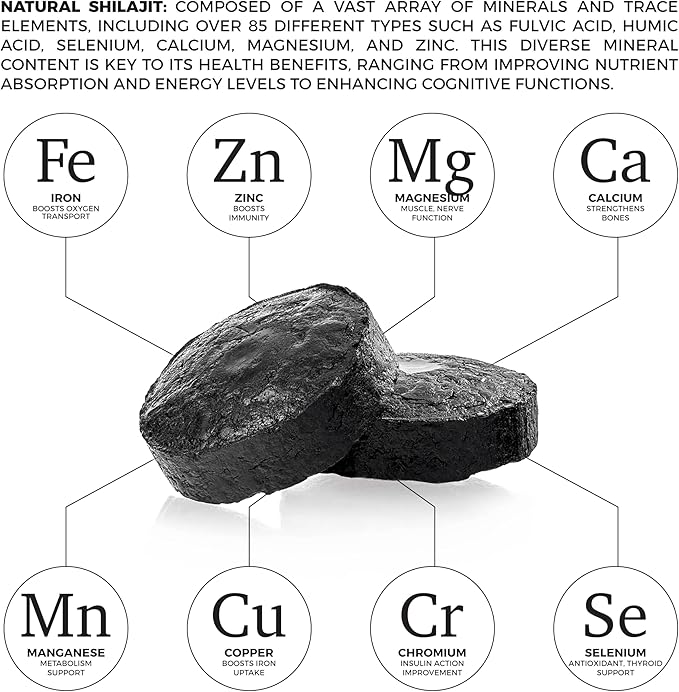- Cognitive & Immune Support: Unlock your mental clarity and support your immune system. Shilajit is renowned for its cognitive-enhancing properties, aiding in focus, memory, and overall brain health. Its rich mineral content also contributes to a robust immune defense, promoting your body's resilience.