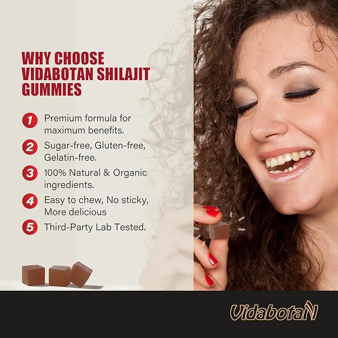 - [Vegan, Gelatin Free, Sugar free]: Each bottle of Vidabotan shilajit gummies is made of 90 vegan, all natural, non-GMO & gluten-free, sugar free gummies.
