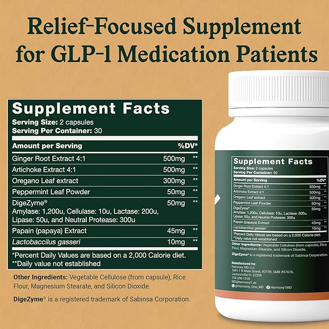 - Unique Formula: Crafted by leading gastroenterologists & internists, Harmony-1 includes ginger root, artichoke, oregano & papaya extracts, peppermint leaf, digestive enzymes & a probiotic to help reduce side effects associated with GLP-1 medications.