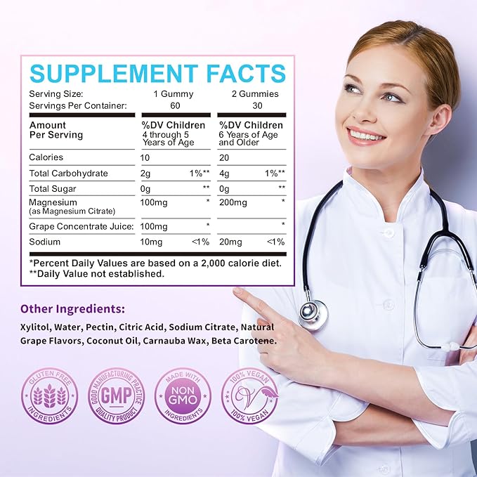 - Natural & Yummy - Our kids magnesium gummies are crafted from premium ingredients, free from artificial flavors or colors, non-GMO and gluten-free. Bursting with natural grape flavor, these delectable gummies offer a delightful chew and quickly become a favorite among kids. Treat your child to a daily dose of health and happiness with our irresistible magnesium gummies