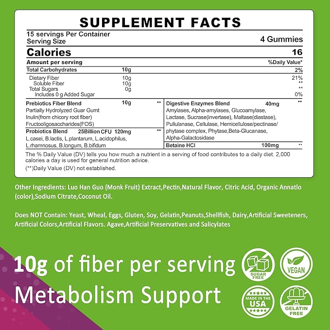 Fiber Gummies for Adults, Sugar Free 10g Prebiotic Fiber Supplement with Digestive Enzymes, Probiotics & 100mg Betaine for Digestive & Gut Health and Regulate Bowel Movement, Vegan, Gelatin Free,120ct