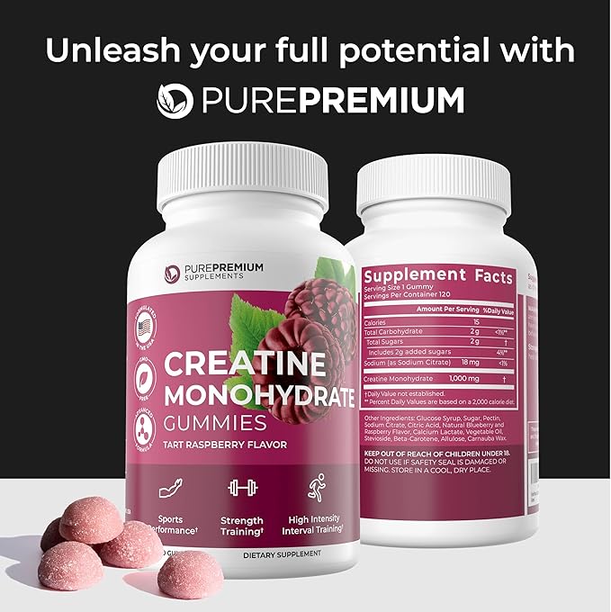 - VERIFIED POTENCY: Unlike other brands that may exaggerate their content claims, each PurePremium creatine gummy contains 1g of lab-verified creatine monohydrate. For optimal results, take 5 our creatine gummies daily to support your workout routine.*