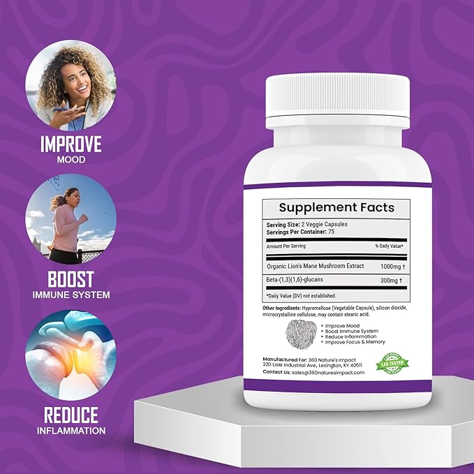 360 Nature's Impact Lions Mane Mushroom Supplement Capsules (150 Capsules) for Brain Health Support Supplement, Organic Supplement with Beta-Glucans & Hypromellose for Cognitive System