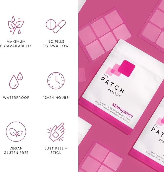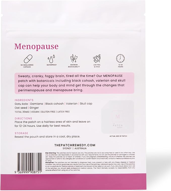 - NATURAL MENOPAUSE RELIEF - The Patch Remedy's Menopause Patches are designed to help alleviate the uncomfortable symptoms of menopause & perimenopause. Use them day or night when sleeping, they are Infused with potent botanicals like black cohosh, valerian, and skull cap, these patches can help reduce hot flushes, mood swings, and sleeplessness.