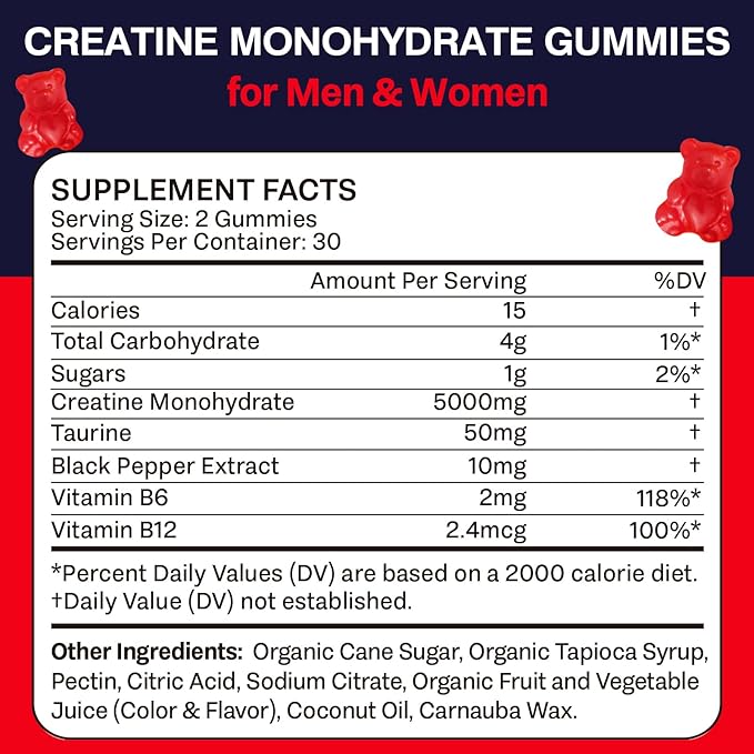 - Organic Ingredients & Vegan: We prioritize your health above all else. Creatine monohydrate gummies feature organic ingredients for pure supplementation. Our vegan, non-gluten, and non-GMO formulation sets a new standard for your path to vitality. Elevate performance with creatine goodness in a more natural and healthy way