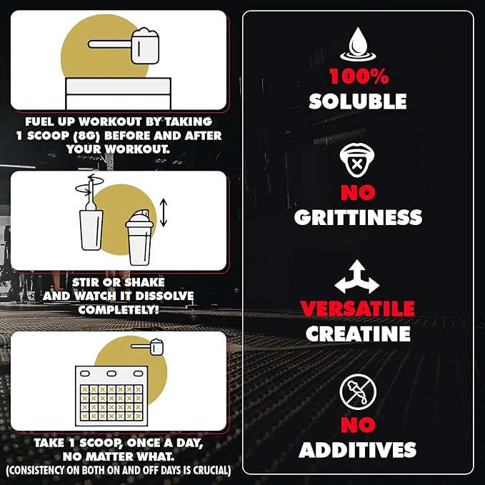 - 1 SCOOP, ONCE A DAY - Take one 5g serving of creatine using the included premeasured scoop, every day no matter what for optimal gains and recovery. For every 5g serving use 16 oz of room temperature water and gently stir or shake for 30-60 seconds until completely dissolved and clear. Also mixed great in any pre or post workout shakes.