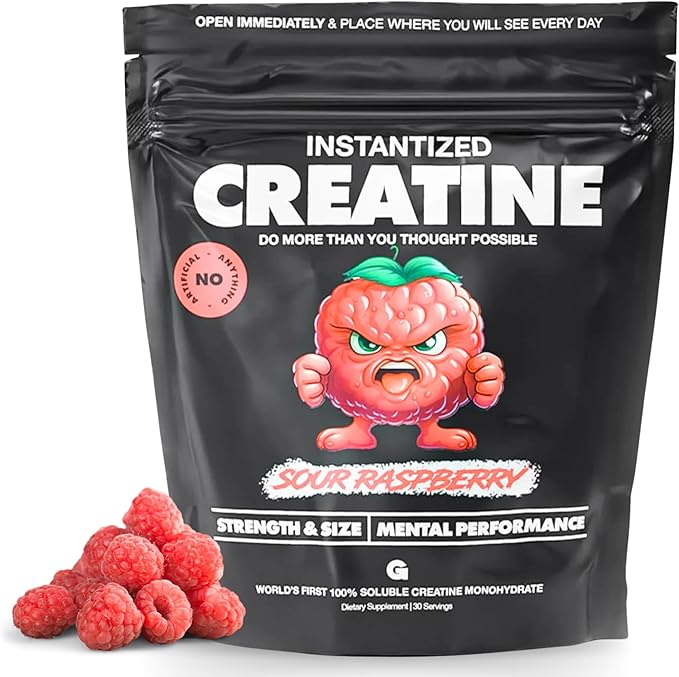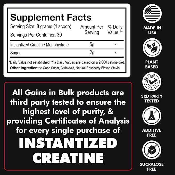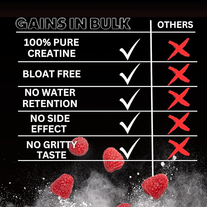 Gains in Bulk Instantized Creatine Monohydrate Powder - Pre Workout Supplement, Support Muscle Endurance, High Energy and Cognitive Function, 100% Soluble, No Bloating (30 Servings, Sour Raspberry)