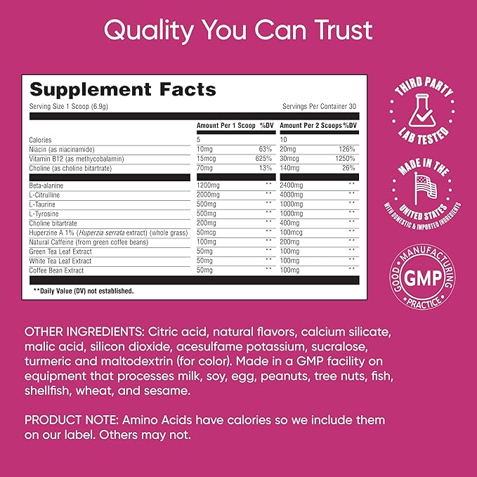 - CUSTOMIZABLE DOSAGE: Designed with flexible dosing to fit your needs. Use one scoop for quick energy and a brain boost, or use two scoops for a pre workout to help optimize performance.