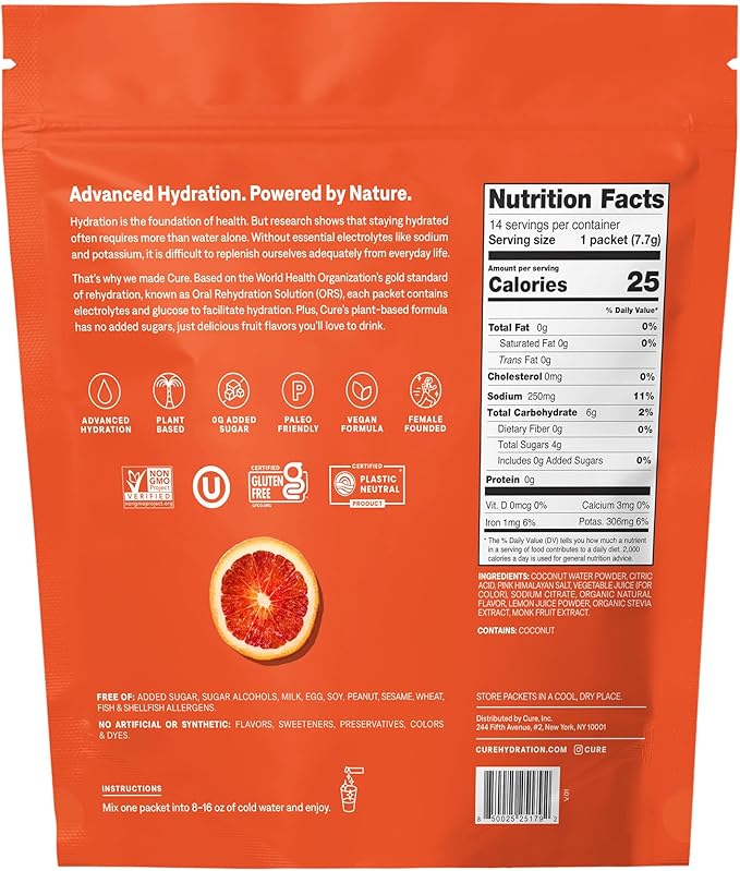 Cure Hydration | Plant-Based Electrolyte Drink Mix | No Added Sugar | Dehydration Relief Powder Made with Coconut Water | Non-GMO | Vegan | FSA & HSA | Pouch of 14 Packets - Blood Orange
