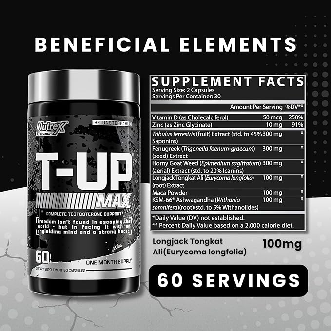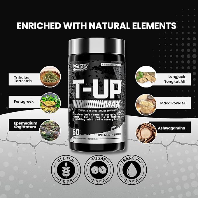 - Testosterone Boosters: Experience a significant and natural increase T levels with T-UP featuring Tongkat Ali & Ashwagandha - two powerful nutrients to help boost natural T production - a vital hormone for muscle growth and strength. Optimized T plays a crucial role in your level of overall fitness and body composition.