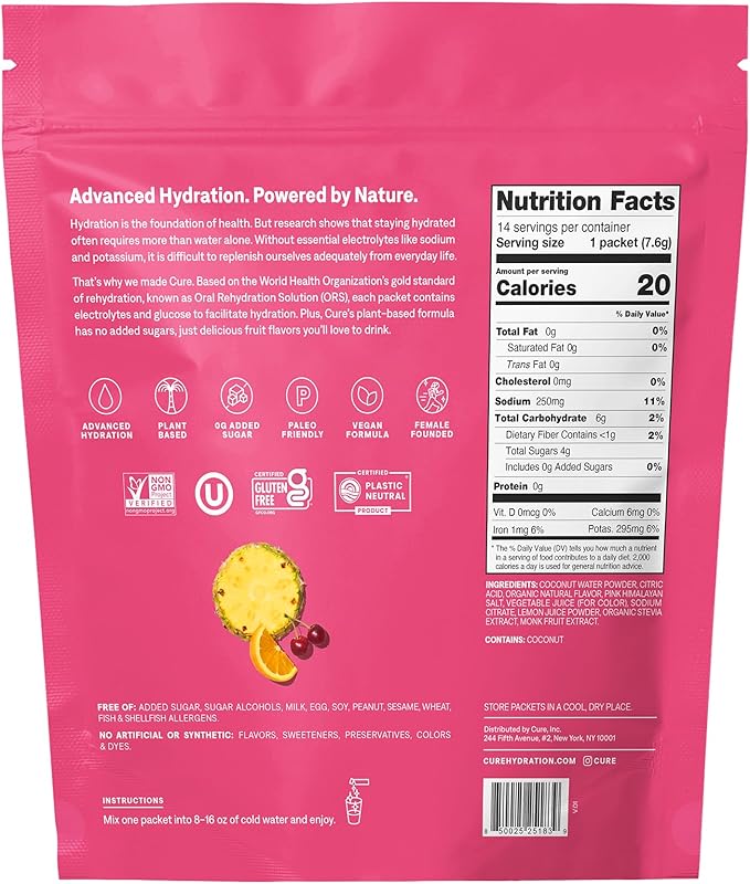 Cure Hydration | Plant-Based Electrolyte Drink Mix | No Added Sugar | FSA & HSA | Dehydration Relief Powder Made with Coconut Water | Non-GMO | Vegan | Pouch of 14 Packets - Tropical Punch