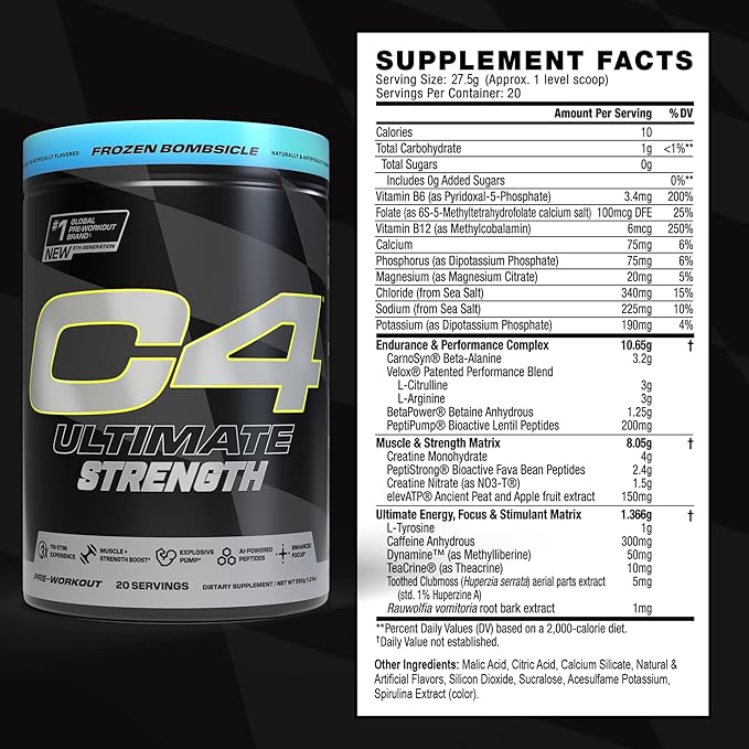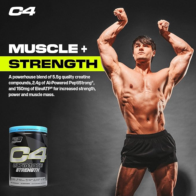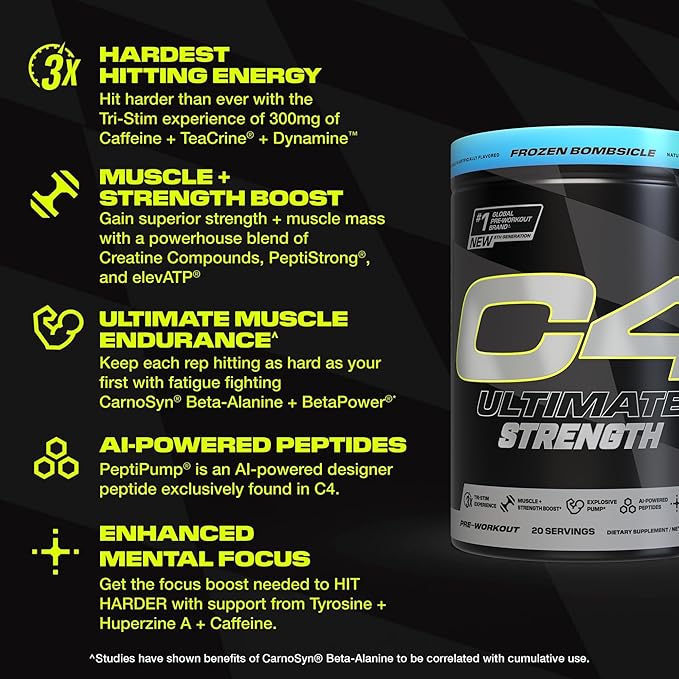 Cellucor C4 Ultimate Strength Pre Workout Powder - Tri-Stim Experience 300mg Caffeine+TeaCrine+Dynamine - Creatine & Beta-Alanine - Energy Supplement for Men & Women - Frozen Bombiscle, 20 Servings