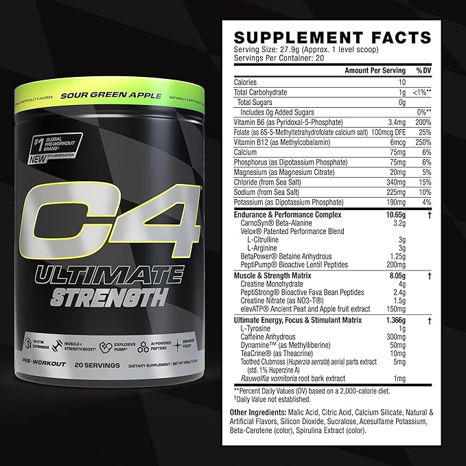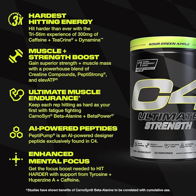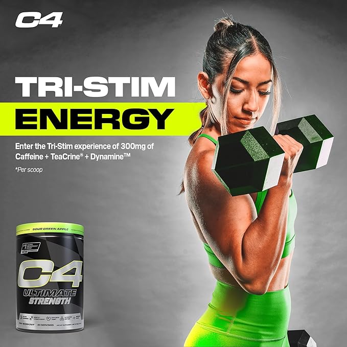Cellucor C4 Ultimate Strength Pre Workout Powder - Tri-Stim Experience 300mg Caffeine+TeaCrine+Dynamine - Creatine & Beta-Alanine - Energy Supplement for Men & Women - Sour Green Apple, 20 Servings