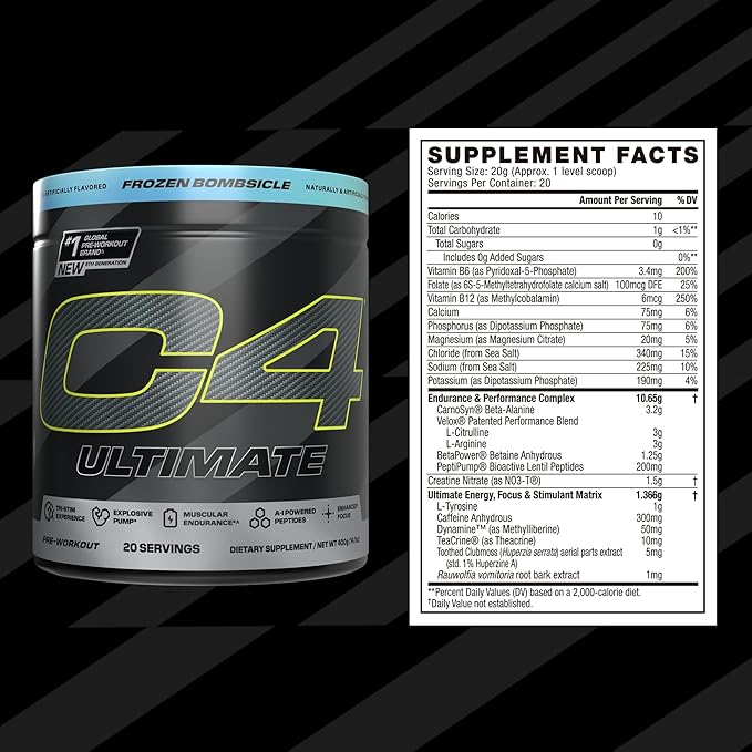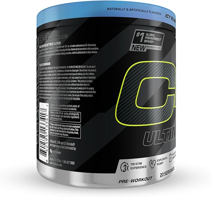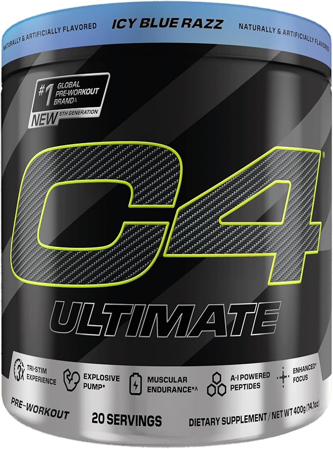 Cellucor C4 Ultimate Pre Workout Powder - Sugar Free Preworkout Energy Supplement for Men & Women - 300mg Caffeine + TeaCrine + Dynamine + Creatine - ICY Blue Razz, 20 Servings