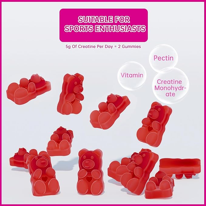 - CHEWABLE CREATINE MONOHYDRATE GUMMY: Strawberry flavored gummies, based on creatine and pectin. Creatine monohydrate gummy has a beautiful bear shape, providing you with energy while maintaining a delicious taste. Better absorption