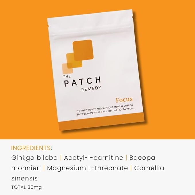 The Patch Remedy Focus Patches - Topical Focus Patch Plus Ginkgo Biloba, Acetyl-l-Carnitine, Bacopa Monnieri, Magnesium L-Threonate, & Camellia Sinensis, 30 Transdermal Patches for Adults & Kids