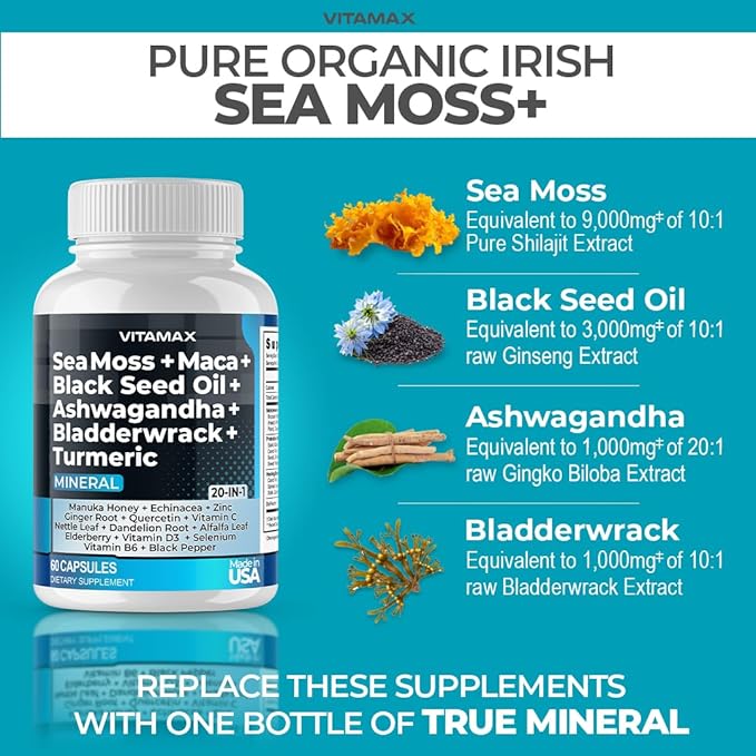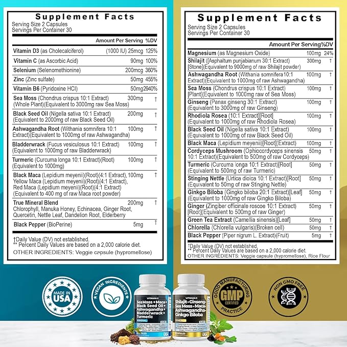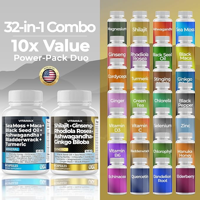 - Ultimate Mineral Power Pack Duo: Embrace the enduring vigor of Shilajit capsules, sourced from the Himalayas and packed with over 80 trace minerals including iron, calcium, magnesium, zinc, and fulvic acid. Delve into the abundant benefits of Sea Moss, containing 92 essential minerals and vitamins in a single supplement. Feel the synergistic boost to your immune system as these natural powerhouses work together, streamlining your path to wellness.
