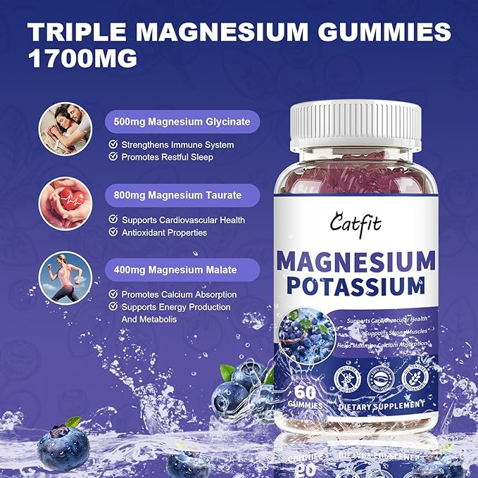 - POTASSIUM MAGNESIUM SUPPLEMENT PREMIUM FORMULA:Our potassium magnesium gummies contain Magnesium Glycinate 500mg,Magnesium Taurate 800mg,Magnesium Malate 400mg,Potassium Gluconate 100mg,Sodium 10mg,Vitamin D3 10mcg ,Vitamin B6 1.5mg,Vitamin B12 2.4mcg,Calcium 100mcg,Zinc 15mg,Coenzyme Q10 100mg and Black Pepper 5mg.Blueberry Flavor magnesium gummies for adults.60 gummies per bottle.