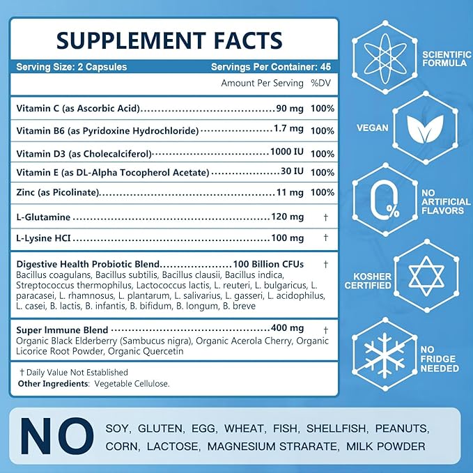 - PROBIOTICS FOR IMMUNE SUPPORT: Our product includes amino acids that aid in forming immune proteins, and enhancing antibody production. Vitamins C, D3, and E, are known for their powerful antioxidant properties. Immune Blend helps immune cells maintain optimal conditions. Additionally, 70% of the immune system resides in the digestive tract, and 100 Billion CFUs can bolster intestinal immune cells. Quadruple ingredients work together to bolster your immune support.