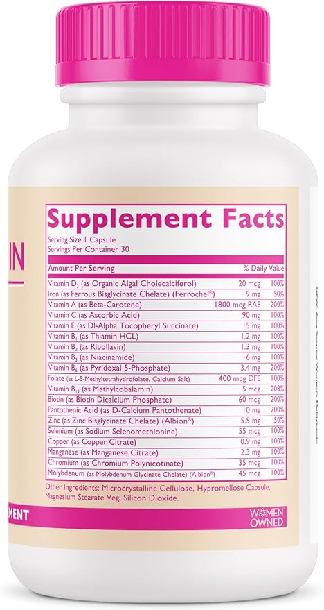 - Women's Vitamins: Dedicated to helping women achieve whole-body wellness, Amy Suzanne Women's Multivitamin is essential to your daily ritual. One easy-to-swallow capsule daily provides 19 vital nutrients (including Methylated Folate, B Complex Vitamins, Iron, Biotin, Zinc, Chromium + Vitamin D) targeted for women's health. Perfect for women of all ages and stages of life to protect your body + mind.