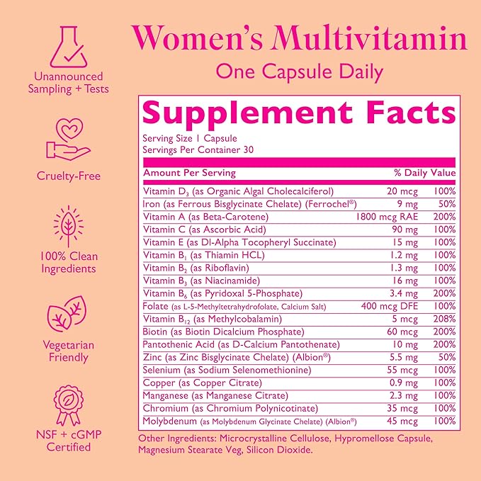 Women's Multivitamin - 19 Targeted Vitamins & Nutrients for Women - Supports Hair, Skin & Nails, Cognitive Health, Focus, & Heart Health - 1 Vegan Capsule Daily, 30 Day Supply