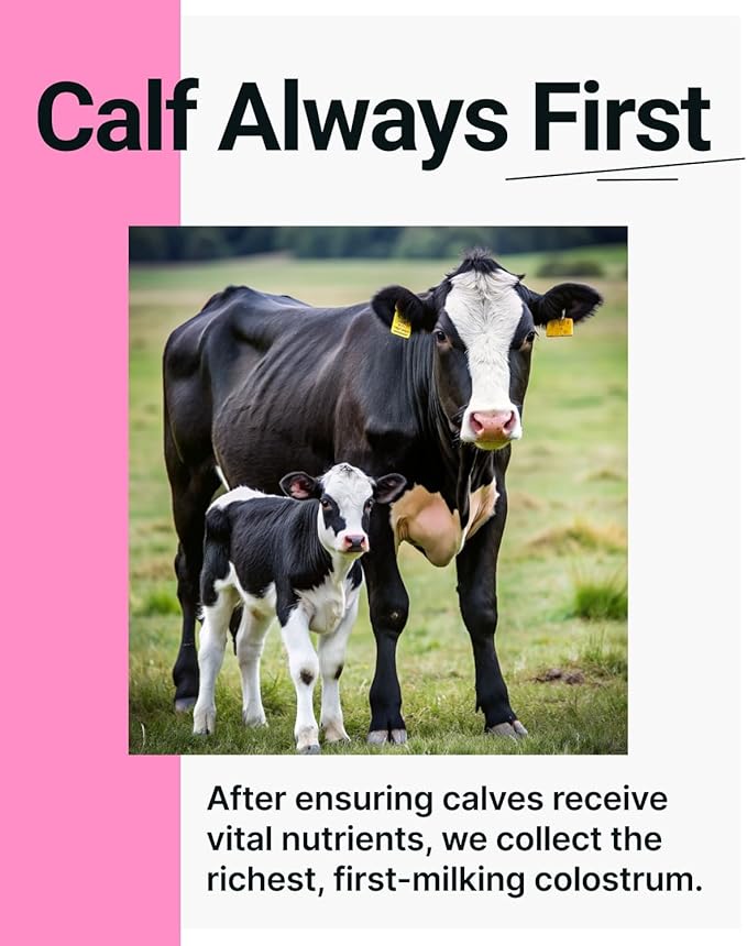 - TRUE 6-HOUR FIRST MILKING COLOSTRUM: Our process honors the critical first 6 hours after birth, a time when colostrum is richest in immunoglobulins and vital bioactives essential for the newborn calf's health. Adhering to our 'Calf First, Quality Next' principle, we allow calves to feed first, ensuring they receive the essential nutrients they need. Only afterward do we collect what remains, securing the most nutrient-dense portion before regular milk production begins. This meticulous timing guarantees our colostrum is not only ethical but also packed with the highest levels of natural goodness for your health.