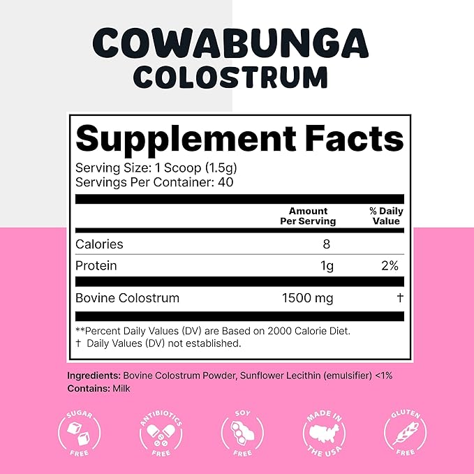 - HOW TO USE COWABUNGA COLOSTRUM: Enhancing your wellness with our colostrum powder is effortless and enjoyable. Each package includes a 3-gram scoop for easy dosing. Kick off your regimen with 3 grams per day, simply added to water, your favorite smoothie, or even protein shakes. (hot beverages not reccomneded as they can destroy bioactives) For those who appreciate convenience and taste, our colostrum is delicious enough to be taken straight as a dry powder — no mixing required. After two months, consider increasing your intake to 6 grams daily to further boost your nutrient absorption and health benefits.