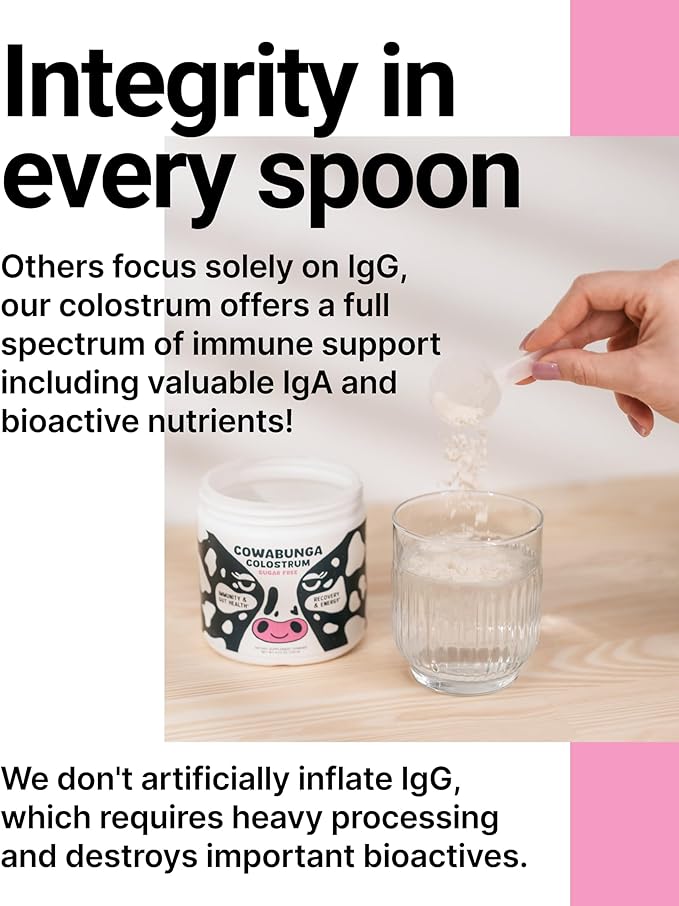 - FULL SPECTRUM-BEYOND JUST IGG: Unlike the ultra-processed alternatives focused solely on inflating IgG levels, our colostrum powder maintains the purity and full spectrum of nutrition as nature intended. While it includes IgG for immune system support, our formula also preserves IgA, fatty proteins, and vital bioactives that are often destroyed during heavy processing when trying to increase IgG numbers. This means our colostrum offers comprehensive wellness benefits — supporting not just the immune system but also gut health and overall vitality.