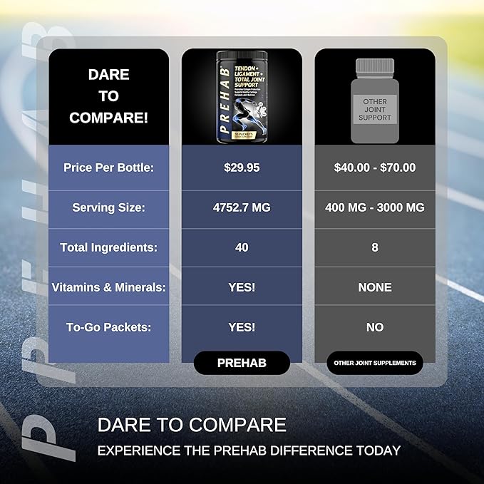 - DISCOVER SUPERIOR JOINT SUPPORT - Joint health, including tendon, ligament and cartilage health, is vital for the success and longevity of any athlete. With PREHAB, you can help support your body in optimizing the health of this critical connective tissue.