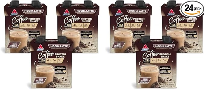 - AT HOME OR ON-THE-GO. Atkins Mocha Latte Iced Coffee Protein Shakes. Enjoy delicious shakes that fit right into your busy schedule, with 15g of protein, 4g of net carbs, 1g of sugar per serving*, and as much caffeine as a cup of coffee.
